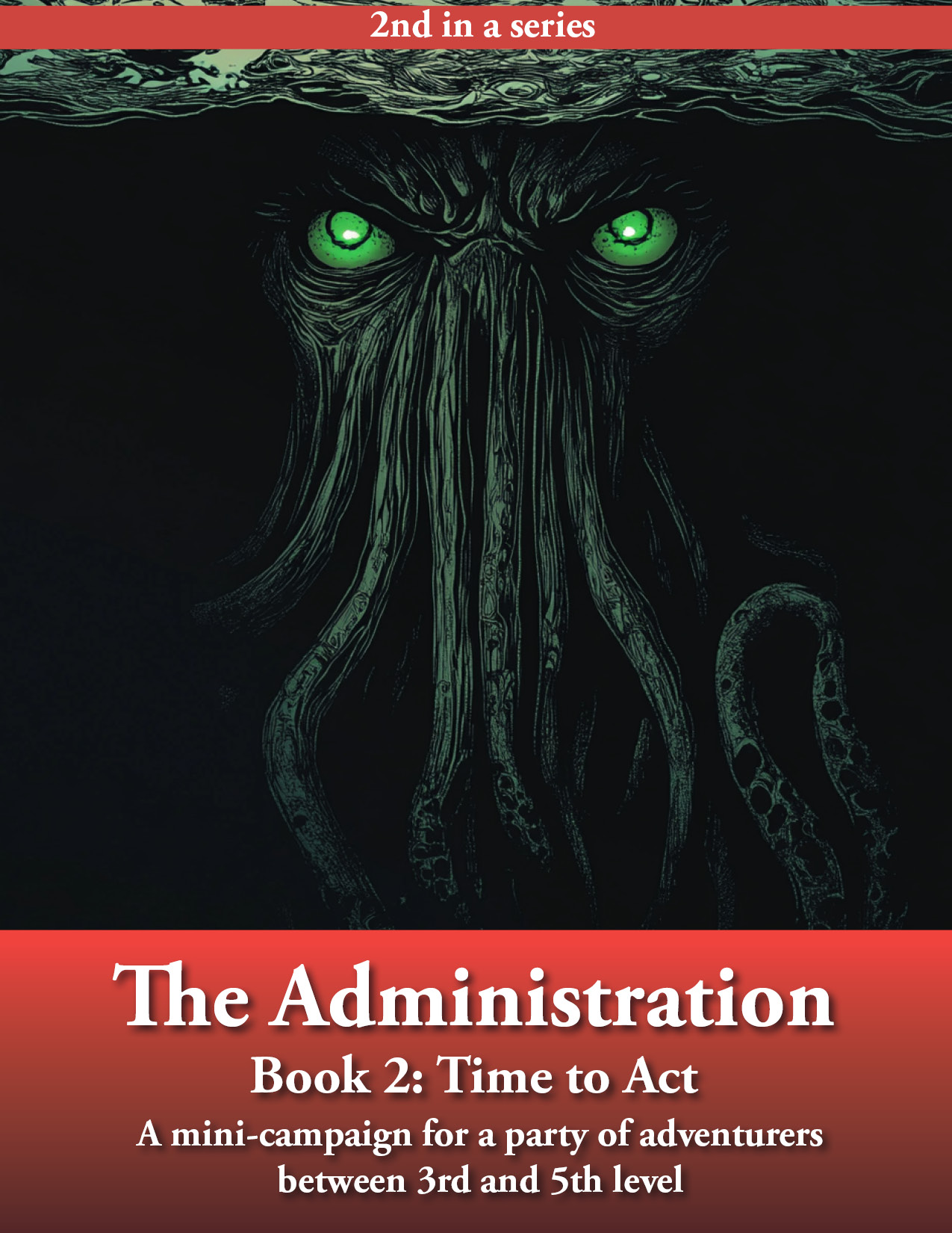 The Administration: Book 2, Time to Act, is a D&D 5E mini-campaign designed to follow the Dungeons and Dragons mini-campaign, The Administration: London by Night. It is intended for characters level 3 to 5.
